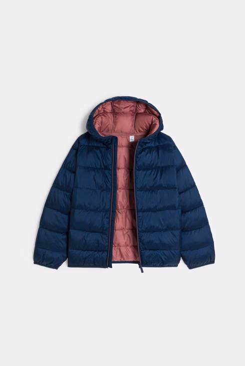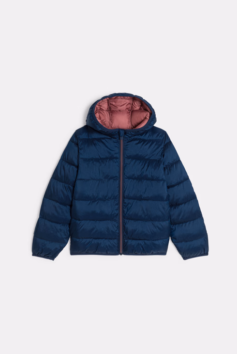 Jednobojna mornarskoplava prošivena pernata jakna s kapuljačom za djevočice