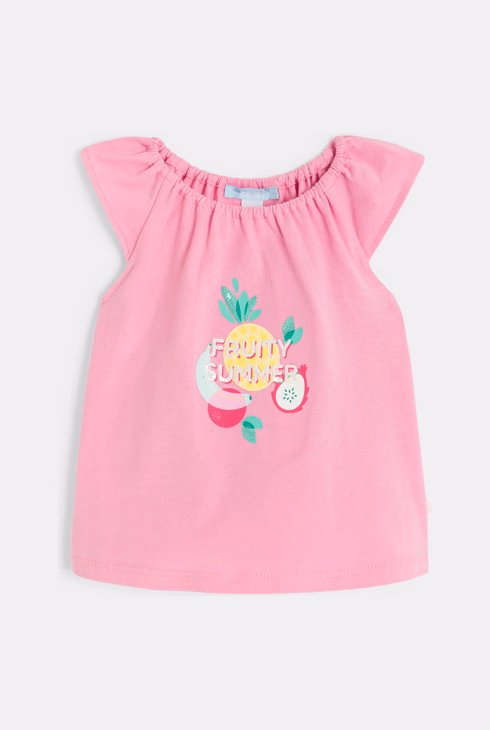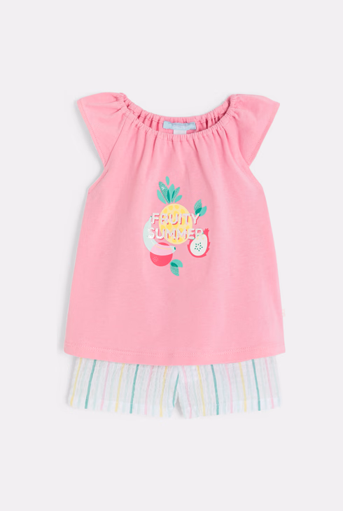Ružičasta majica kratkih rukava s rastezljivim ovratnikom i printom voća i prugaste kratke hlače za djevojčice