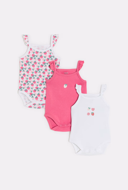 Ružičasti bodi s naramenicama i motivom jagode za djevojčice (pakiranje od 3 komada)