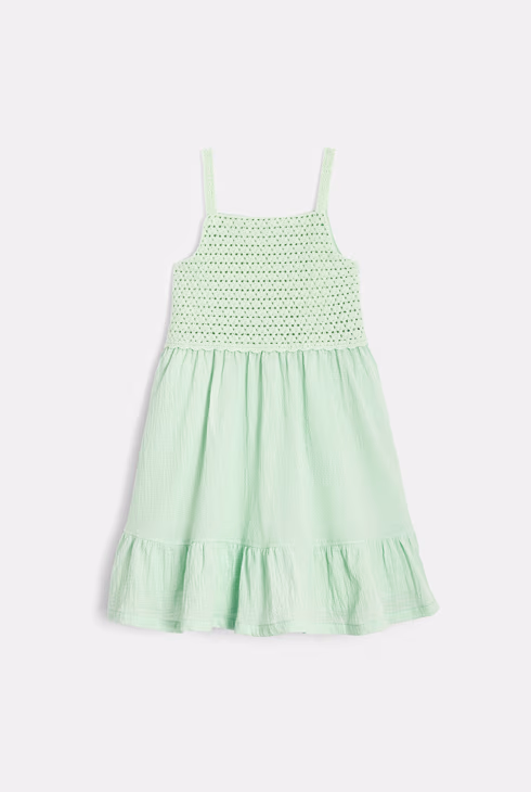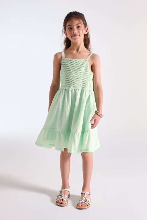 Zelena haljina s naramenicama s kukičanim detaljem i volanom za djevojčice